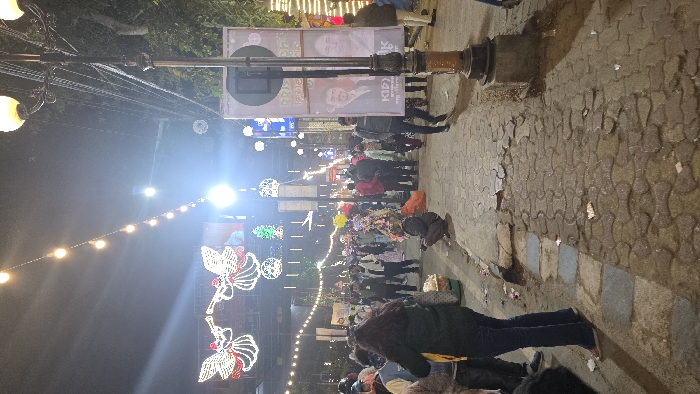 A crowded street scene at night is illuminated by strings of lights and decorative floral fixtures. Pedestrians stroll along a brick pathway, some engaging with street vendors. Political posters adorn lampposts, suggesting an event or election. The light from the fixtures creates a bright ambiance amidst the evening darkness.