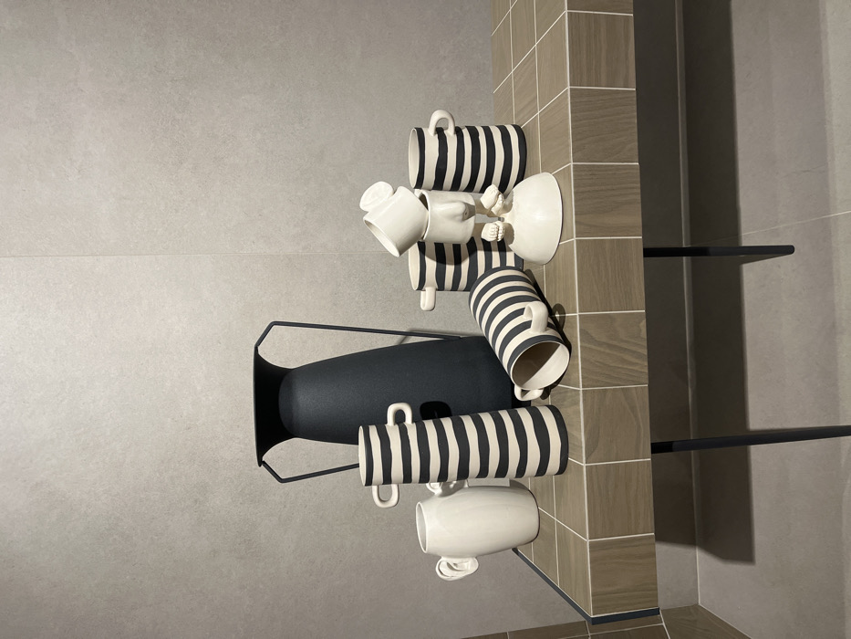 The image displays an indoor still life arrangement of various ceramic art pieces on a tiled bench against a plain light grey wall. In the background, a large, matte dark grey amphora-style vase with two upward-extending, angular wire-like handles stands centrally. To its left, a tall, cylindrical vase with wide horizontal black stripes on a cream background features two small ear-like loop handles. Further left is a white, bulbous vase with two prominent, anatomically shaped ear-like handles. In the foreground, a similar striped cylindrical mug lies horizontally on its side. To the right, a sculptural arrangement of stacked cream-colored ceramic components depicts abstracted human forms, including a domed base, small feet, a torso, and two inverted cups forming a head, with one cup featuring a small handle. Two additional tall, cylindrical mugs with horizontal black stripes on a cream background and small loop handles stand upright to the right of the sculpture. The objects rest on a rectangular bench with a surface covered in light brown square tiles, edged with a darker strip, supported by slender black metal legs. The floor below the bench is a solid light grey. There are no individuals present. The specific location in Bologna, Italy, cannot be determined from the visual information provided.