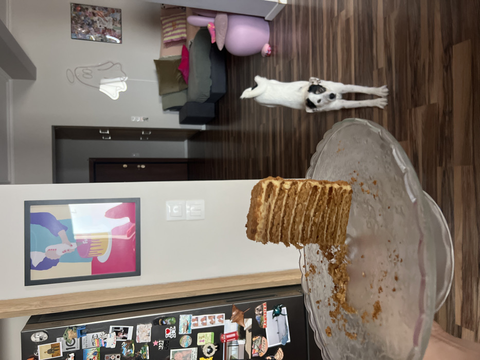A room shows a slice of layered cake on a plate in the foreground. A white dog with black spots stretches on the wooden floor. Behind the dog, there is a grey couch with colorful pillows and a pink ottoman. In the background, there is a doorway, a dark wooden cabinet, a modern painting, and light switches on the wall above a refrigerator covered in magnets.