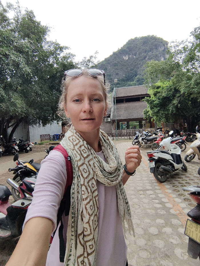 An outdoor scene in Hoa Lư Ward, Vietnam, features one individual positioned for a selfie in the foreground. The subject is a light-skinned female with blonde hair, estimated to be in her 30s to 40s, looking directly at the camera with a neutral expression. She wears a light pink long-sleeved shirt, a cream-colored scarf with a brown and green geometric pattern, and sunglasses resting on top of her head. A red backpack strap is visible on her left shoulder, and a dark beaded bracelet is on her right wrist, with her right hand slightly clenched. The setting is a paved outdoor area, possibly concrete or large pavers, with faded orange lines indicating parking spaces. Numerous motorcycles and scooters are parked throughout the midground, characteristic of Vietnamese transportation. Visible license plates, such as "29-H1 022.34" and "35-B1 931.14," confirm a Vietnamese location. In the midground, behind the parked vehicles, stands an open-sided building with a dark, multi-tiered roof, supported by visible pillars, consistent with traditional Vietnamese architecture. To the left of this building, a plain, light-colored wall is partially visible, obscured by dense green trees and foliage. The background is dominated by a large, steep karst limestone mountain or hill, covered in vegetation, under an overcast sky. Various other green trees are scattered throughout the scene.