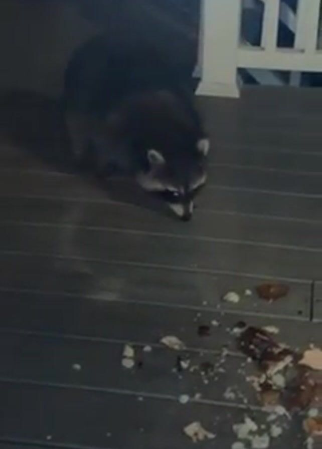 raccoon on a wooden deck eating discarded food. The raccoon is facing the camera. There is a white railing in the background. The raccoon is dark grey and has a black mask. The food is scattered on the deck. The lighting is dim. The video is shot from a high angle. There are audible voices in the background.