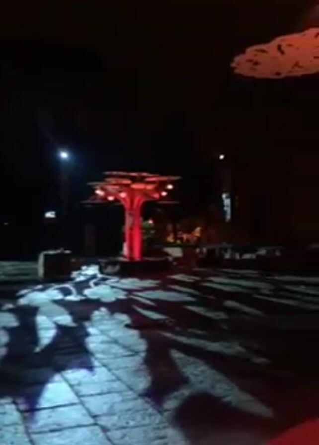 The video depicts an outdoor public space at night. The ground is paved with light gray stone tiles, and it is illuminated by a source of light that creates complex patterns of leaf-shaped shadows on the ground. In the background, a structure resembling a stylized tree is visible. The tree appears to be made of wood or a similar material, with a trunk formed by multiple vertical wooden bars and a canopy of stylized leaves. The tree is illuminated by red lights, which give it a warm glow. The canopy is also adorned with several glowing spherical lights that appear to be pink or white. Further in the background, there is a partially obscured, ornately decorated building lit with white lights. The overall atmosphere of the scene is calm and visually intriguing.