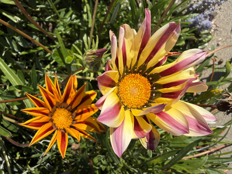 Two vibrant gazania flowers fill the frame, set against a backdrop of green foliage. The flower on the left displays sharp, pointed petals in hues of orange and red stripes. The flower on the right shows yellow petals with streaks of red and hints of pink at the tips. A small bud sits to the left of the right flower. The centers of both flowers are bright yellow and textured.