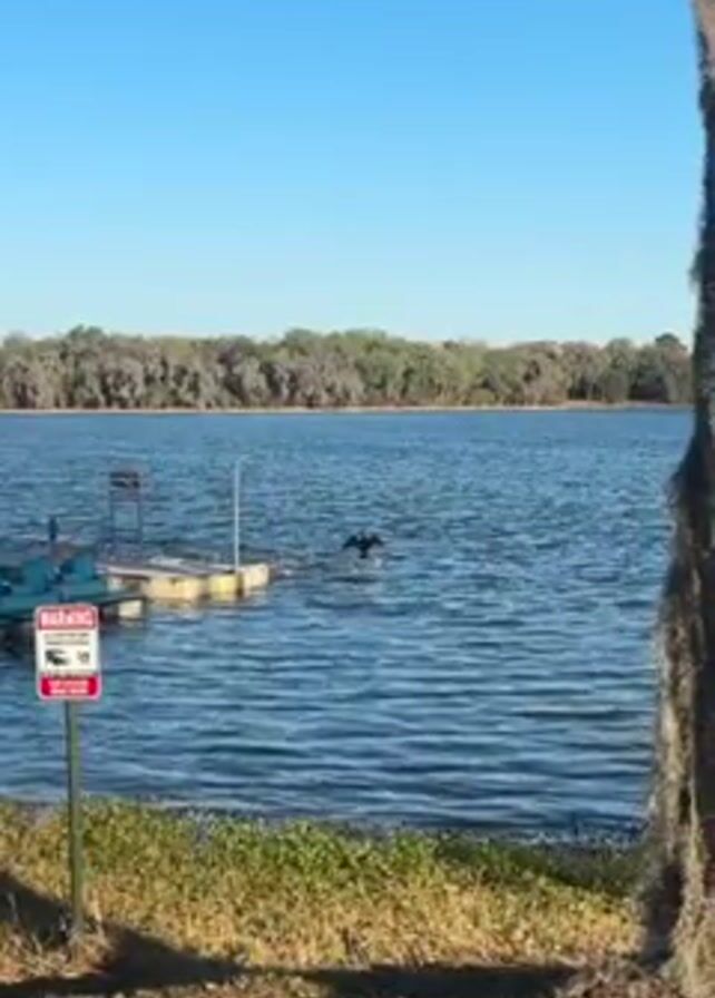 serene lake under a bright blue sky, with a lush green shoreline of trees lining the opposite side. A small dock with floating platforms is visible on the water. A black bird stands on the dock, flapping its wings. To the left of the frame, a red and white warning sign is attached to a post. A tree trunk with Spanish moss hangs to the right.