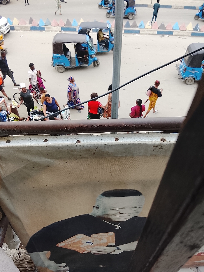 An elevated view shows a bustling street scene with pedestrians, auto rickshaws, and vehicles. People are walking along the roadside, some gathered around a street vendor. A large banner dominates the foreground, displaying a man wearing a black shirt with an image of a book, looking at the screen. Metal beams are present on the right side of the picture.