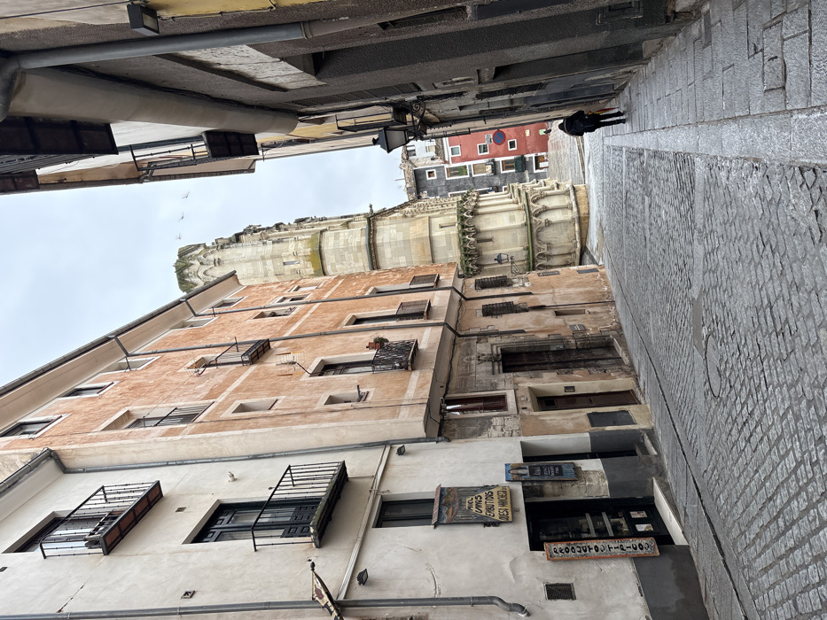 The image captures a narrow, sloping cobblestone street in Cuenca, Spain, under an overcast sky
