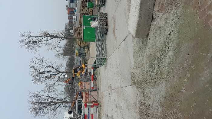 This image displays an outdoor construction site under an overcast sky in Amsterdam, Netherlands