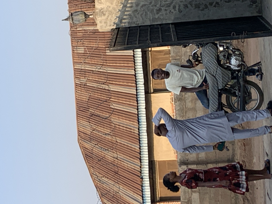 Three individuals stand outside a building with a rusty metal roof. A young woman in a red floral dress is on the left. A man in a light blue outfit is next to her, with his arm raised to his head. Behind them and to the right, a young man is grinning, leaning on a parked motorcycle. The background includes a metal gate and a brick wall. The sky is visible above the building.