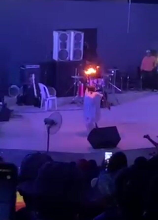 A person dressed in white pants and top performs a fire-breathing act on a stage illuminated with blue light. They hold a flaming torch up to their mouth, spewing fire into the air. A drum kit and other musical equipment are visible behind them. The person is performing for a silhouetted audience, some of whom are recording with their phones.