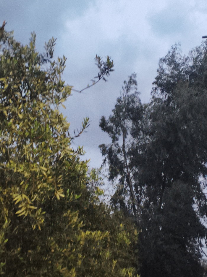The sky is overcast and gray, partially obscured by trees. On the left, a tree with dense, yellowish-green foliage fills much of the frame. In contrast, a darker, taller tree stands to the right, its thin trunk visible against the sky. A single, thin branch with sparse leaves stretches horizontally in the center of the frame. The overall scene is muted and suggestive of a cloudy day.
