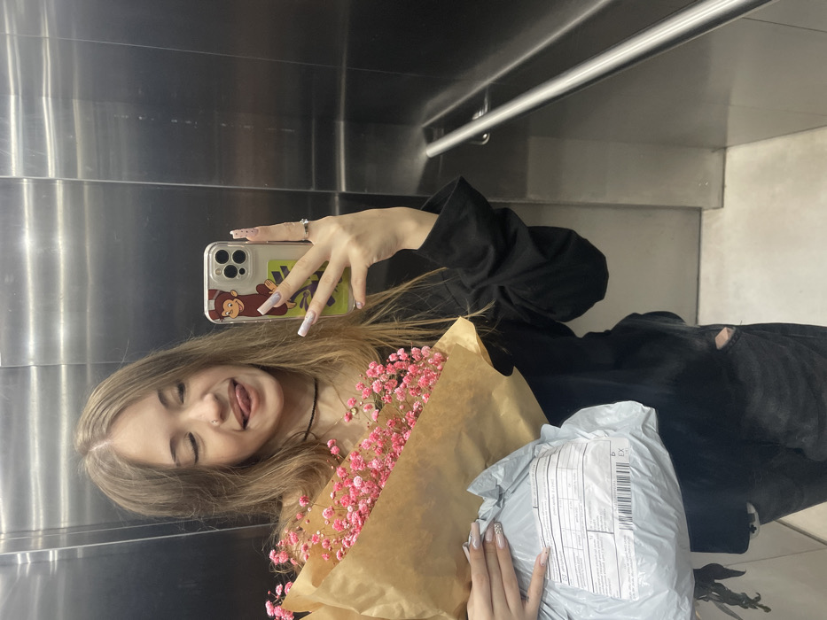 A young female subject is depicted in a mirror selfie taken within an elevator located in Raanana, Israel. The elevator interior consists of brushed stainless steel walls, a light-colored floor, and a horizontal metal handrail visible on the right wall. The female, with long, light brown hair, wears a black long-sleeved top and distressed black jeans. She has a visible nose stud, a black choker necklace, and a pendant necklace. Her expression shows her tongue slightly extended. In her left arm and hand, she holds a bouquet of small pink flowers wrapped in brown paper, and a gray plastic mailer package with a partially visible shipping label and barcode. Her right hand holds a silver-colored iPhone, featuring multiple camera lenses and a clear case adorned with a Curious George character on a lime green background. Her long fingernails are manicured with a white-tipped design and dark specks. A silver-colored ring is present on her right ring finger.