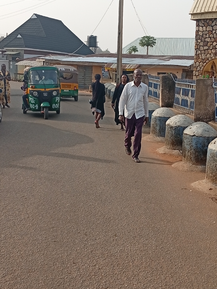 The image depicts a street scene in Jos, Nigeria, characterized by pedestrian and light vehicular traffic under hazy daylight conditions. In the foreground, an older man of African descent walks towards the camera on the right side of the asphalt road. He wears a white long-sleeved shirt, dark purple trousers, and dark sandals. His left arm is slightly bent, and his right arm hangs at his side. Behind him, two women of African descent walk in the same general direction. The woman closer to the man wears a dark top and a light-colored knee-length skirt/dress, appearing barefoot or in light footwear. The second woman, further back, wears dark clothing. On the left side of the road, a green "Keke Napep" (auto-rickshaw) is visible, bearing "PTA-004" and "PTA-800" on its front, with a driver discernible inside. Behind it, another beige-colored Keke Napep, marked "PTA-71," is also present. A person in a patterned garment is partially visible on the far left. The right side of the road is bordered by a series of gray, dome-shaped concrete bollards with blue tops, separating the road from a blue metal fence with square patterns. Behind the fence, a stone-clad wall structure with an arched opening is visible, suggesting a building or compound entrance. In the background, a tall utility pole stands on the left. Several single-story buildings with corrugated metal roofs and light-colored facades line the street. Behind these, a multi-story building with a distinctive dark pyramidal roof and a prominent water tank on a stand is visible. Small trees or shrubs can be seen, including two growing from a rooftop further back on the right. The road surface is asphalt, and elongated shadows are cast on the ground, indicating a low sun angle.