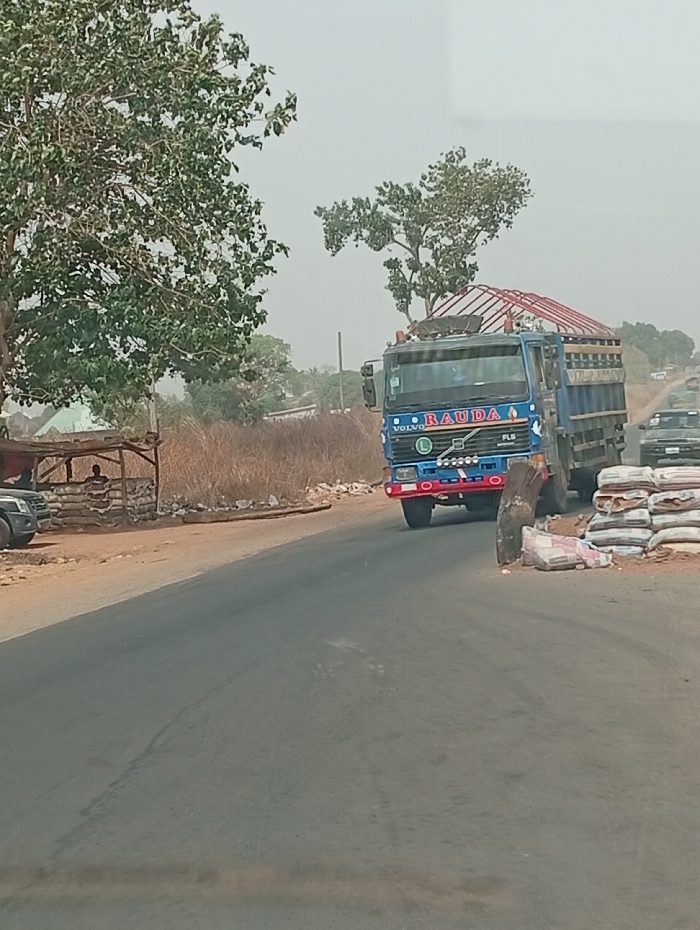 The scene, located in the city of Peyer, Nigeria, captures a roadside environment under a hazy sky. A blue Volvo FL6 heavy-duty truck, labeled 'RAUDA' on its front grille, proceeds on the right side of a two-lane asphalt road, heading towards the observer. The truck's cargo bed carries a large, reddish metal frame structure that extends above the cab. Immediately adjacent to the truck on the road's unpaved shoulder is a stack of white sacks. On the opposing side of the road, beneath a large tree with green foliage, a wooden makeshift stall is present. Within this structure, a single individual is seated, visible as a dark silhouette. A dark SUV is partially visible, parked near the stall on the left. The surrounding environment consists of dry, light-brown vegetation, with additional vehicles discernible further down the road in the distance.