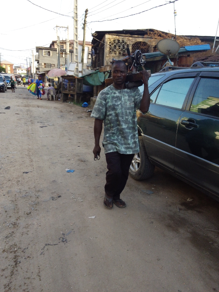 A man carries a sewing machine on his shoulder while walking down a dirt road. He wears a patterned shirt, dark pants, and sandals. A dark green SUV is parked on the side of the road. In the background, there are buildings, some with satellite dishes, and people under umbrellas, suggesting a market or commercial area. Power lines are visible overhead. The overall environment appears to be a less affluent urban setting.