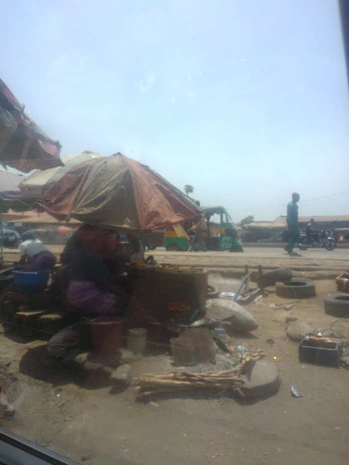 This image depicts a bustling roadside scene in Mista Ali, Nigeria, under a bright, hazy sky
