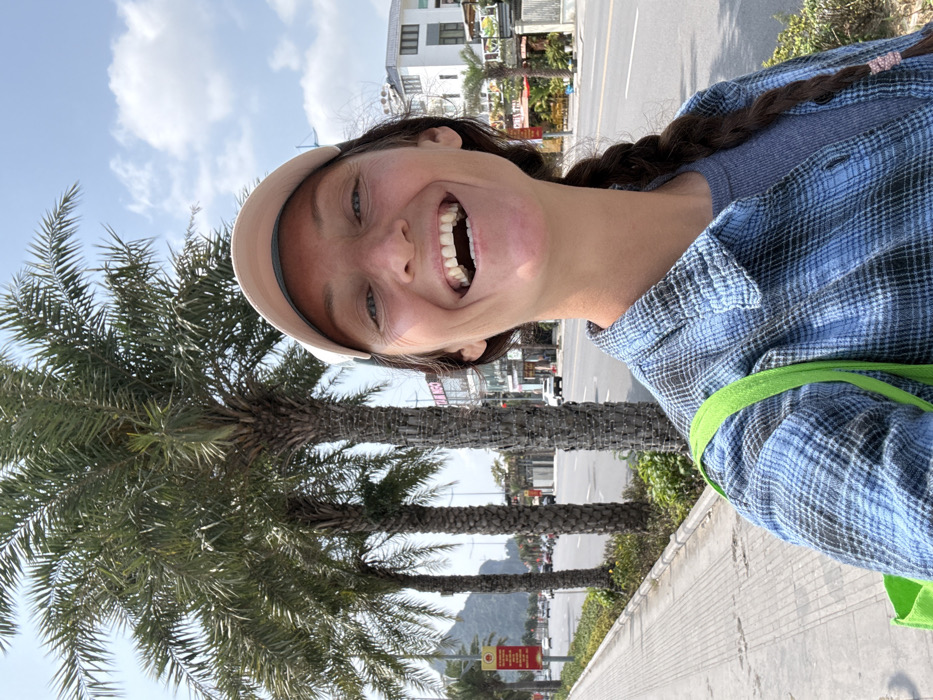 An adult female is depicted in a selfie-style photograph, smiling broadly with an open mouth, revealing teeth. She wears a light-colored baseball cap, a blue plaid long-sleeved shirt over a grey t-shirt, and a bright green bag strap over her left shoulder. Her dark hair is braided. The scene is set in Hong Gai Ward, Vietnam, under a partly cloudy sky. On the left, a paved sidewalk runs parallel to a median strip containing a row of mature palm trees with fibrous trunks. Beyond the median, a multi-lane asphalt road accommodates vehicular traffic, including cars and motorcycles, moving in both directions. In the distant left background, prominent limestone karsts are visible. A red banner with yellow text, likely Vietnamese, is affixed to a pole beside the road. Across the road on the right, multi-story buildings with commercial fronts and signage, including the partially visible Vietnamese word "NGỌ," line the street. Additional palm trees are present along the right side of the road.