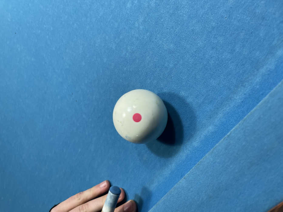 A close-up, high-angle view captures a billiard scene on a blue felt table in Haskovo, Bulgaria. A white cue ball, marked with a prominent central pink dot, rests on the fabric surface, casting a shadow to its lower left. In the upper left quadrant, a person's right hand, with light skin, forms a bridge while holding a billiard cue stick. The cue's tip, visibly chalked in blue, is poised directly behind the cue ball, indicating preparation for a shot. The blue felt shows minor textural variations, and a dark wooden rail of the billiard table is partially visible along the bottom edge of the frame.