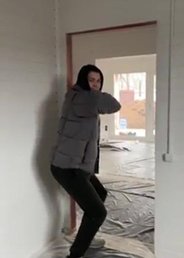 A person wearing a grey puffy jacket, dark pants, and grey sneakers is dancing in a room with white paneled walls. They are facing the doorway leading to another room covered in plastic sheeting. A window is visible in the other room. The person is smiling and appears to be enjoying themselves.