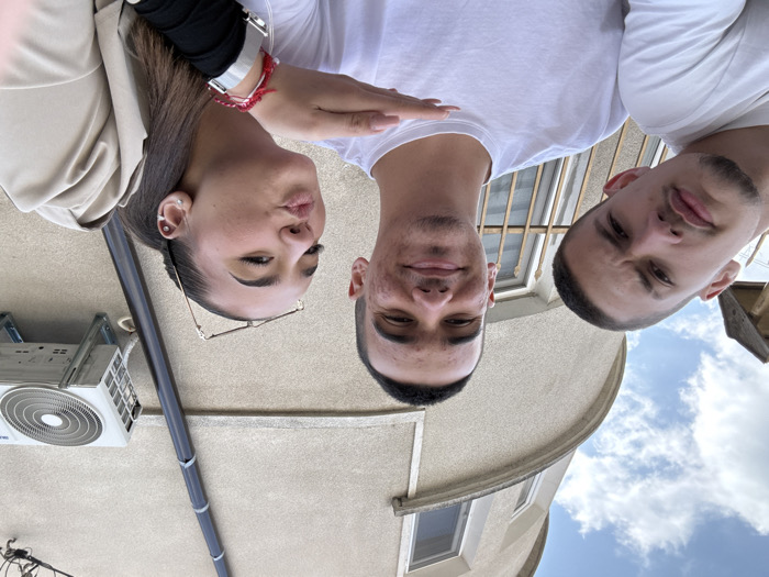 Three individuals are depicted in a selfie-style photograph taken outdoors in Shumen, Bulgaria, during daytime under a partly cloudy sky