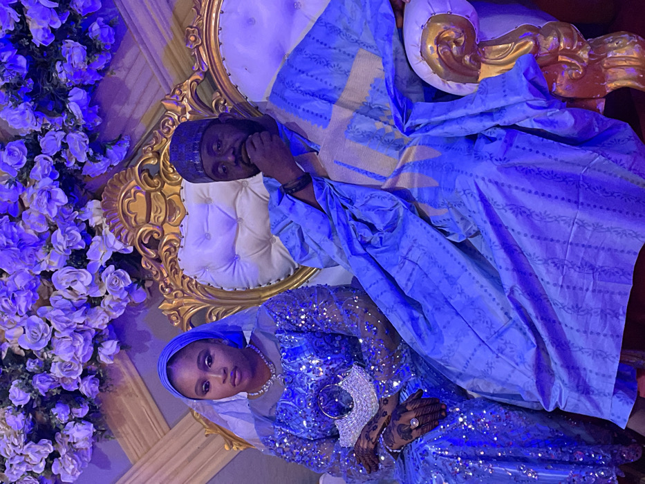 A man and woman in blue traditional attire sit on an ornate gold and white throne