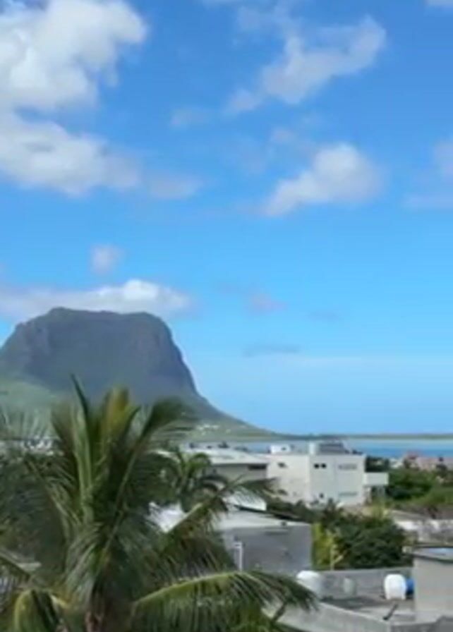 The scene is a sunny day with a blue sky and scattered white clouds. The camera pans slowly from left to right, revealing a landscape featuring a lush green palm tree in the foreground, partially obscuring the view of rooftops and buildings. In the distance, a large, dark mountain looms, surrounded by the ocean. A communication tower can be seen among the houses, and the ocean stretches towards the horizon.