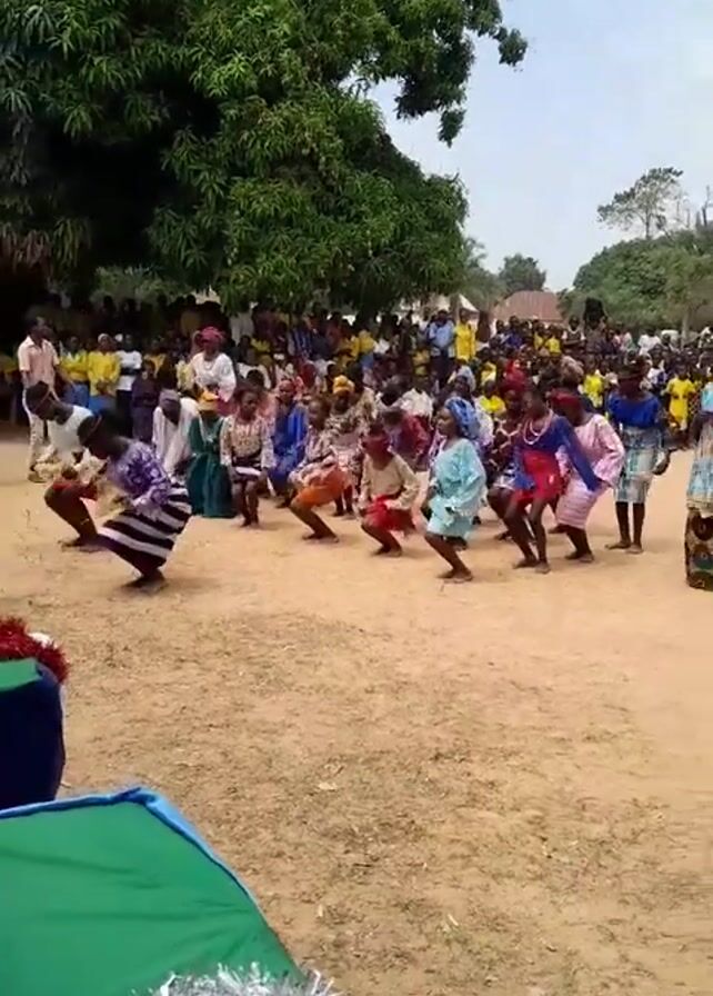 In an open dirt field, a group of approximately ten children, mostly female, dressed in colorful traditional clothing, are performing a choreographed dance in front of a large audience, presumably in a rural setting. They are positioned in the foreground, crouched low with knees bent. Behind them, a dense crowd of people, including adults and children, is gathered, many wearing yellow shirts. A large tree provides shade on the left, and there are glimpses of simple buildings in the background. In the lower left corner are two tables, one covered with blue and another with green cloth, decorated with tinsel. The camera angle is slightly elevated, providing a clear view of the performance and the audience. The scene is illuminated by natural daylight.