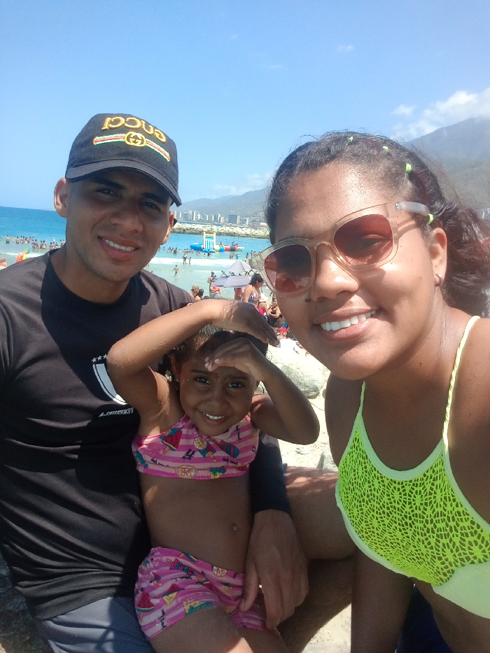 A close-up photograph depicts three individuals—one adult male, one adult female, and one young female child—posing on a beach under a clear blue sky in Caraballeda, Venezuela