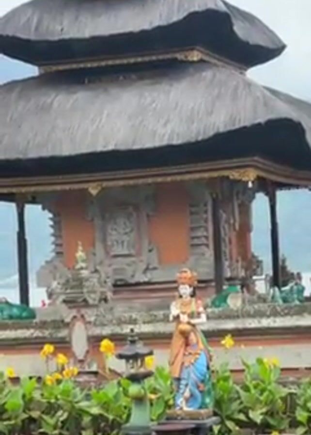 Balinese temple with multiple thatched roofs. The camera pans upwards to reveal the full height of the temple, showcasing its tiered structure. In the foreground, a statue of a woman in traditional Balinese dress stands near a small pond and garden. The sky is overcast, and a lake or body of water can be seen in the background.