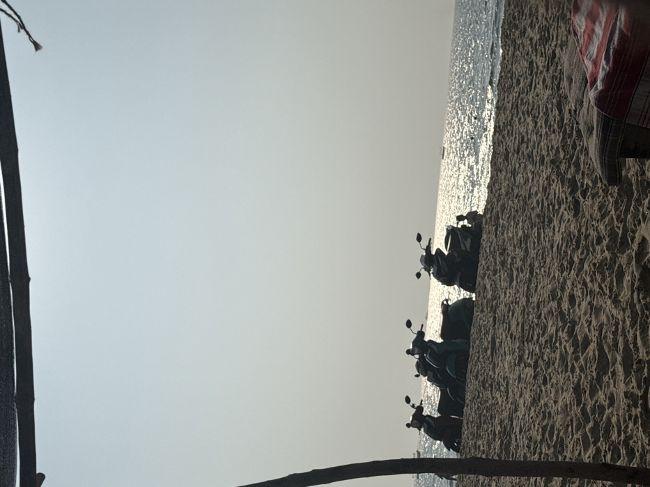 The image displays a beach scene in Bhagatwadi, India, under bright, possibly late afternoon, natural light. The foreground consists of textured sand, leading towards the ocean. On the lower right, a striped fabric, primarily red and white, covers a low, dark-colored object, possibly a cushion or mat. Along the left margin, a dark, vertical support structure, appearing to be a tree trunk or pole, extends upwards. A dark, horizontal beam is visible at the top edge of the frame. In the midground, five two-wheeled motor scooters are parked sequentially on the sand, silhouetted against the brighter background. Their specific colors are obscured by backlighting, but shapes are discernible. To the right of the rightmost scooter, a small human figure, possibly a child, is seated or squatting on the sand near the water's edge. The background features a vast expanse of ocean, reflecting strong sunlight that creates a shimmering, bright surface. Several small, dark shapes, consistent with distant boats, are visible on the water, particularly towards the left horizon. The sky above the ocean is clear, hazy, and pale blue-grey, occupying approximately the upper half of the image.