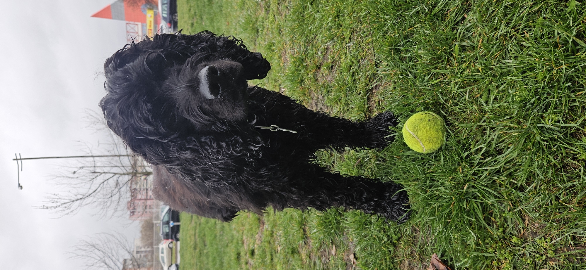 - "A medium-sized black dog with curly fur stands on a patch of green grass next to a yellow tennis ball" by FM-zxmE43, licensed under CC BY 4.0