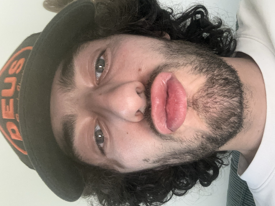The scene is a close-up, head-and-shoulders portrait of an adult male. The individual has dark, curly hair and a dark beard and mustache. He is wearing a dark baseball cap with orange lettering that spells "DEUS" on the front, and a white crew-neck garment. His eyes are open, looking directly at the camera, and his lips are pursed forward in a "duck face" expression. The background is a plain, light-colored wall, with a partial view of a light green ribbed object, possibly a cushion, visible in the lower left corner. The image depicts an individual in an indoor setting in Carnin, France.