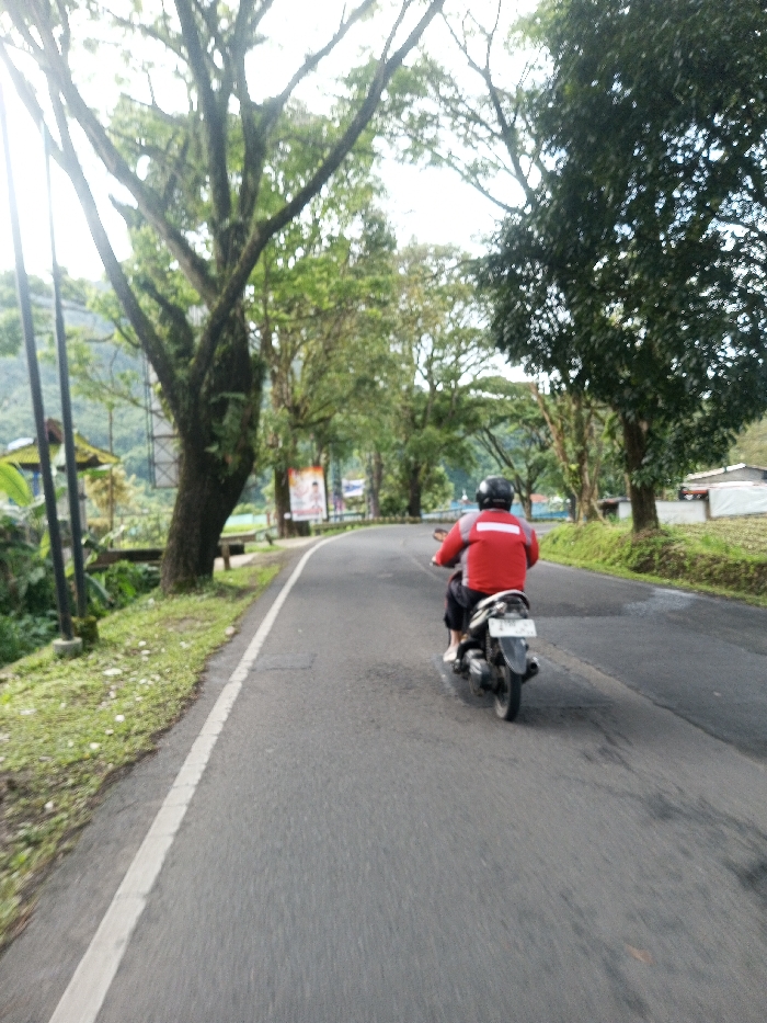 The image displays an individual riding a dark-colored scooter-style motorcycle away from the camera on a paved road in the city of Domphoog_Dungkarchhoeling, Bhutan. The operator is wearing a red long-sleeved shirt with a white horizontal stripe on the upper back, dark lower garments, and a black full-face helmet; bare feet are visible on the motorcycle's footpegs. The road, a dark asphalt surface, features a solid white line marking its left edge and curves slightly to the right in the mid-ground. On the left side of the road, a grassy verge is present, followed by two dark utility poles, the first equipped with a light fixture. Behind these, dense green foliage and a large tree with a thick, moss-covered trunk are prominent. A structure with a blue roof is partially visible amongst the greenery. Further along this side, a large rectangular banner with indiscernible details is mounted. The background on the left consists of tree-covered hills or mountains. The right side of the road features a grassy area and smaller trees. Beyond these, a small building with white siding and a dark roof is visible, adjacent to what appears to be cultivated farmland. The entire scene is dominated by lush green vegetation from numerous trees lining both sides of the road, under an overcast sky.