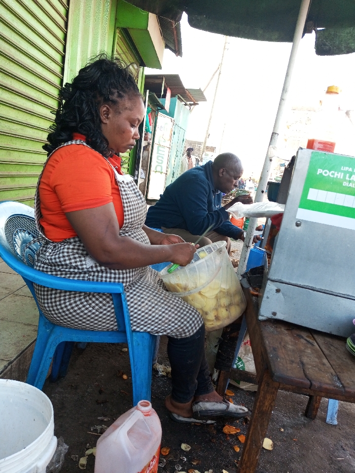 This image, captured in Tala ward, Kenya, depicts an outdoor informal food preparation and sales area. In the foreground, an adult female with dark complexion and dark hair styled in braids is seated on a blue plastic chair, facing left. She wears an orange short-sleeved top and a black-and-white checkered apron over dark trousers. Her hands are engaged in peeling or preparing potatoes from a transparent plastic bucket, which contains numerous cut potato pieces. Organic debris, including potato peels, is scattered on the dark ground beneath her feet. A white plastic bucket is on the ground to her left, and a translucent orange plastic bottle is to her right. In the mid-ground, an adult male with dark complexion and a bald head is seated on a blue plastic stool, facing right. He wears a dark blue long-sleeved shirt and is focused on a small object or container in his hands, appearing to consume food. To his immediate right, a gray metal vendor cart with a wooden top is visible. A green and white sign affixed to the cart partially reads "LIPA NA POCHI LA..." with a "DIAL..." prompt, indicating a mobile payment service. A yellow plastic bottle and a smaller red bottle are present on the cart's surface. Overhead, a white pole supports a green tarp providing shade. The background features a closed green roll-down shutter of a building on the left, with additional indistinct buildings and a distant human figure further along what appears to be a street or pathway.