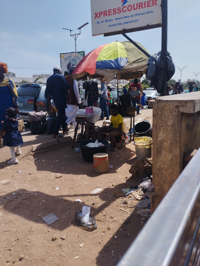 The scene depicts an unpaved outdoor area at No. 41 Yakubu Gowon Way, Jos, Plateau State, Nigeria, under clear daylight. The ground is reddish-brown earth, significantly littered with plastic, paper, and general debris. A prominent white sign, mounted on a pole in the upper right, displays "XPRESSCOURIER" with the address and contact numbers. Centrally positioned, a multi-colored umbrella (red, yellow, blue, green segments) provides shade over a makeshift ground-level stall. A child, dressed in a yellow t-shirt and dark trousers, is seated on a low stool or box beneath the umbrella, facing slightly left. Adjacent to the child are two dark buckets, one containing white items, and a light brown cylindrical container with a red lid and handle. A dark piece of clothing is draped over the sign's support pole. To the left, a dark blue sedan is parked, with several dark-colored luggage bags positioned on the ground beside it. Multiple individuals are present and moving. A woman in a blue patterned dress is partially visible on the far left. A young child in a blue dress and white shoes walks right, carrying a small bag, just ahead of the parked car. Two men, one in a dark blue tunic and white cap, and another in a brown vest and white trousers, walk across the frame from left to right. In the mid-ground and background, additional people are visible walking or standing. Further vehicles are present on what appears to be a road. Two streetlights with solar panels are visible, one prominently on the left. A large billboard with a facial image is partially discernible in the distance. The immediate lower right foreground is partially obscured by a concrete structure and a metal rail. The sky above is clear blue.