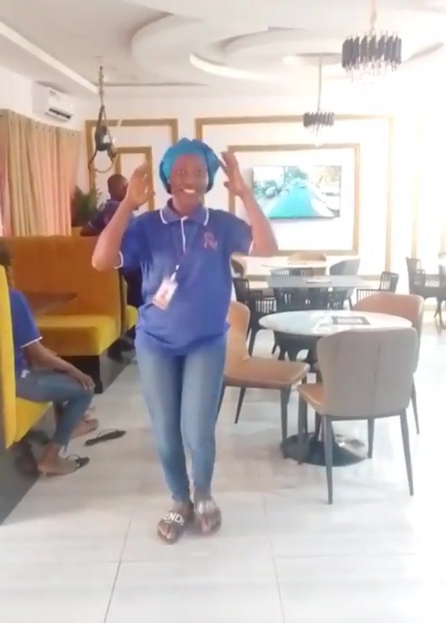 A woman wearing a blue shirt, jeans, and a blue head covering dances in a restaurant
