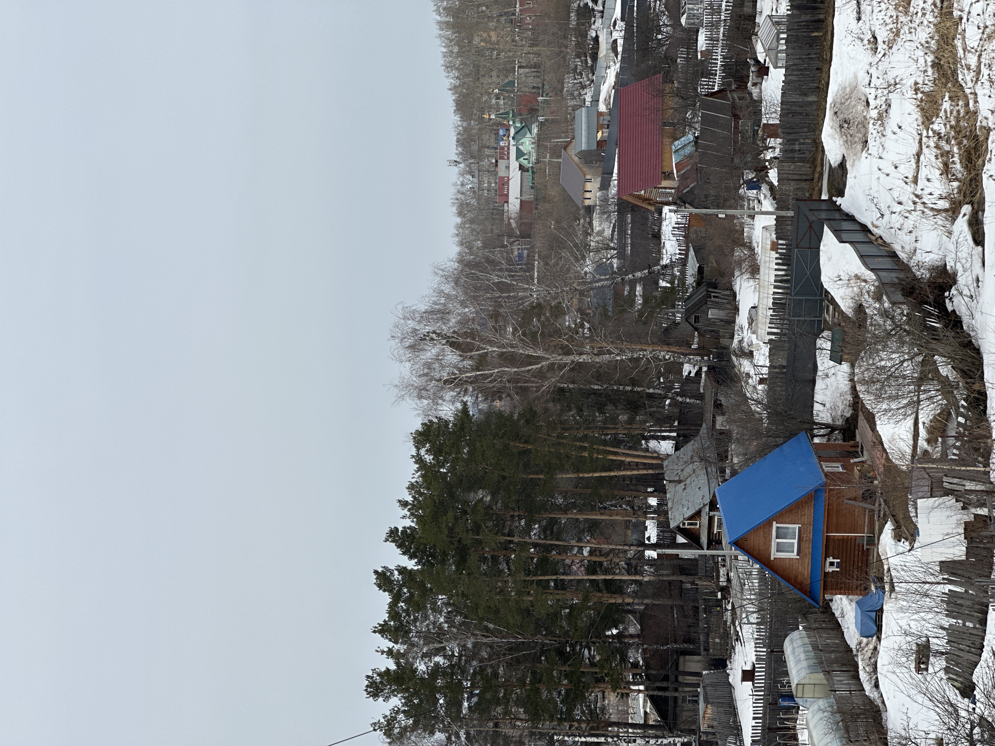 An elevated, wide shot captures a semi-rural residential landscape in Chaikovsky, Russia, under an overcast, light gray sky. The scene is dominated by a late winter or early spring environment, with significant patches of melting snow covering the uneven ground, interspersed with areas of dry, brown vegetation. In the foreground, a dilapidated wooden fence runs horizontally, marking property lines. Visible beyond this are several small, transparent-covered greenhouses, indicating agricultural activity. A dirt path or unpaved road is partially covered by snow and slush. The midground features numerous detached single-family houses, primarily constructed from wood. A prominent two-story wooden house with a bright blue pitched roof and white-framed windows is situated slightly left of center. To its right and further back, another wooden house features a red pitched roof. Surrounding these dwellings are tall evergreen trees, predominantly pines, and numerous bare deciduous trees, including birches with white bark. Various wooden fences, some in disrepair, delineate properties. In the background, more houses and structures are visible, receding into the distance. A notable feature is a building with a green roof and a golden dome, consistent with an Orthodox church or chapel, positioned towards the upper right. A communications tower, possibly a cellular tower, stands against the horizon line, which is marked by a dense line of bare trees. No individuals are visible, and no actions or interactions are depicted within the frame.
