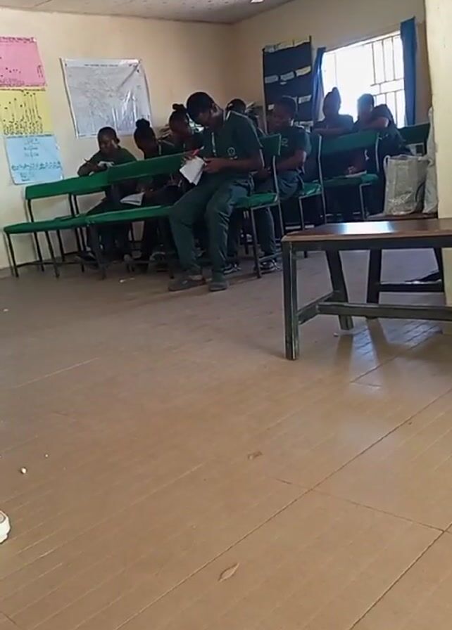 classroom with students in green uniforms sitting on long benches and writing on paper