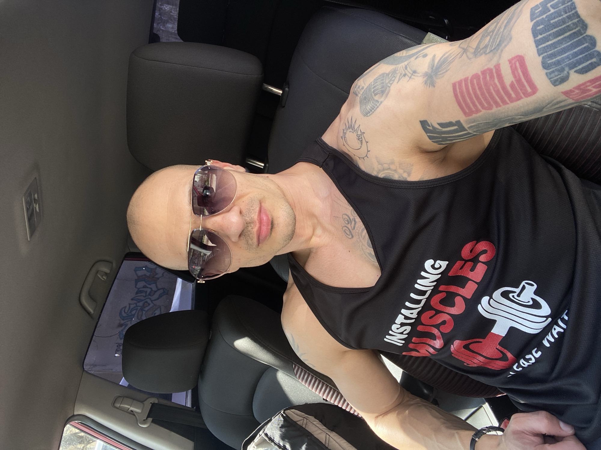 A man with a shaved head and sunglasses sits in the driver's seat of a car. He is wearing a black tank top with the words "INSTALLING MUSCLES, PLEASE WAIT" printed on it. He has extensive tattoos on his arms. The car's interior is visible, with gray seats. Outside the window, there's a glimpse of graffiti on a wall. There is no information to determine the location in the city of Pleven, Bulgaria.