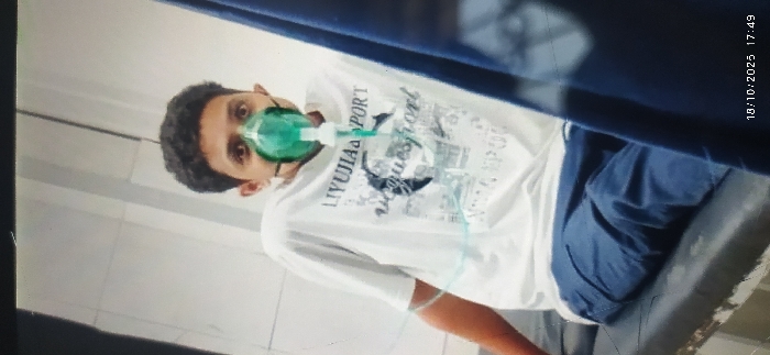 The image depicts a male individual, appearing to be an adolescent or young adult, seated in what appears to be a medical facility within Barza Municipality, Syria