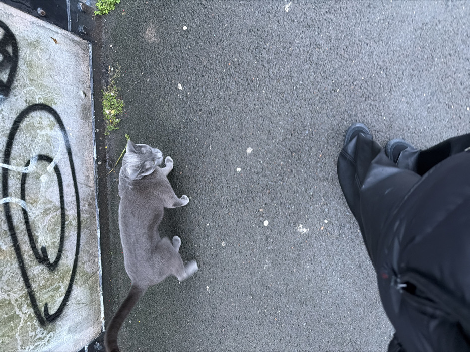 - "From a high angle, a grey cat rests on asphalt near a wall marked with graffiti" by FM-u6xV42, licensed under CC BY 4.0