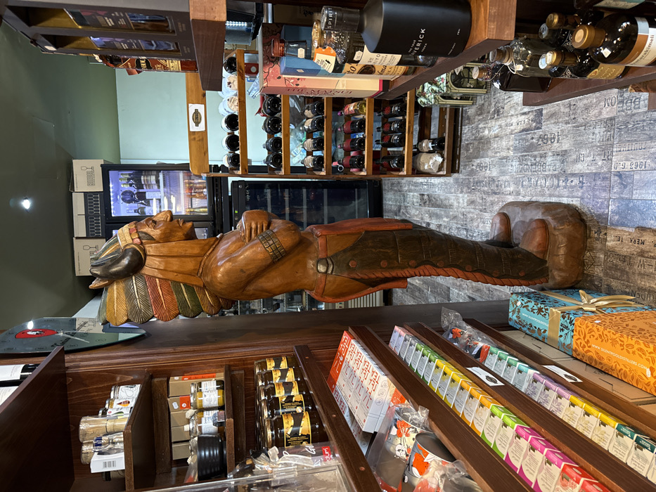 This image depicts the interior of a retail establishment in Paralimni, Cyprus. A prominent, carved wooden statue of an Indigenous American chief stands centrally, depicted in profile facing right, with arms crossed over its chest. The statue wears a multi-colored feathered headdress and traditional painted attire. To the left, dark wooden shelves are vertically arranged, stocked with various jars of food products, bottled items, and packaged goods, including stacks of tea boxes and larger decorative gift boxes on lower shelves. To the right, dark wooden shelves and a multi-tiered wooden wine rack display numerous bottles of spirits and wine. Visible items include a matte black bottle labeled "THE TRUE MAVERICK VODKA." The background features a light green wall behind two black commercial refrigerators containing beverages, with cardboard boxes stacked above them. Recessed lighting fixtures are visible in the ceiling. The floor is composed of distressed wooden planks featuring faded white text. No individuals are present in the scene.