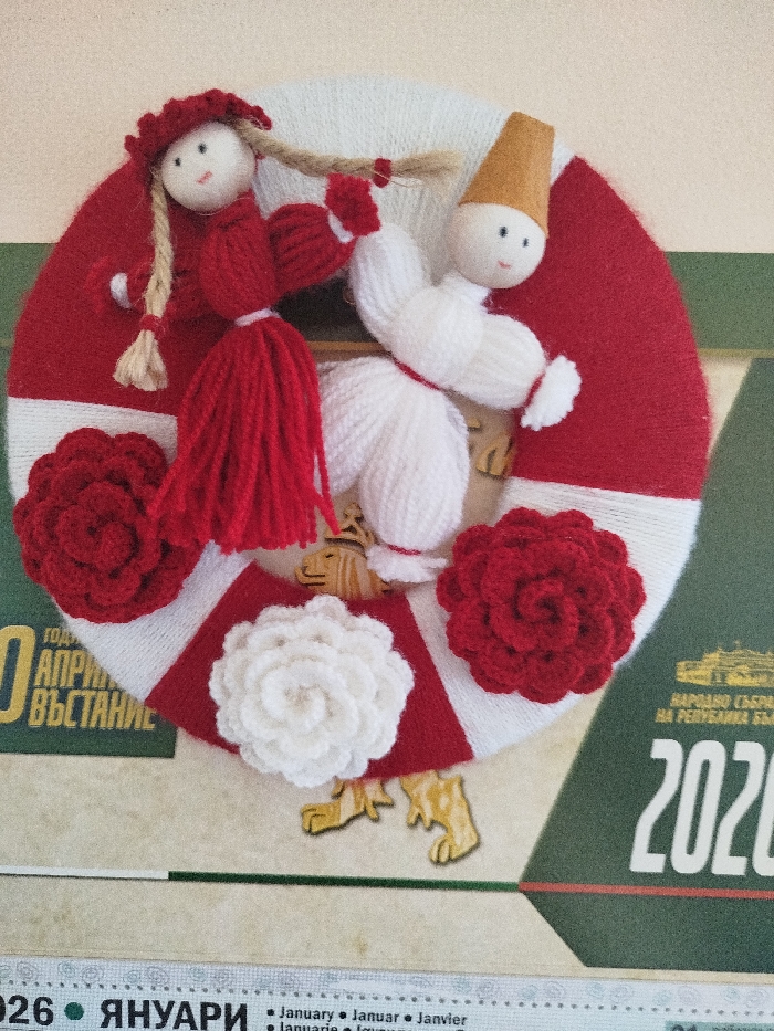A traditional Bulgarian martenitsa, a circular decoration, is depicted from a top-down perspective, positioned centrally against a calendar background
