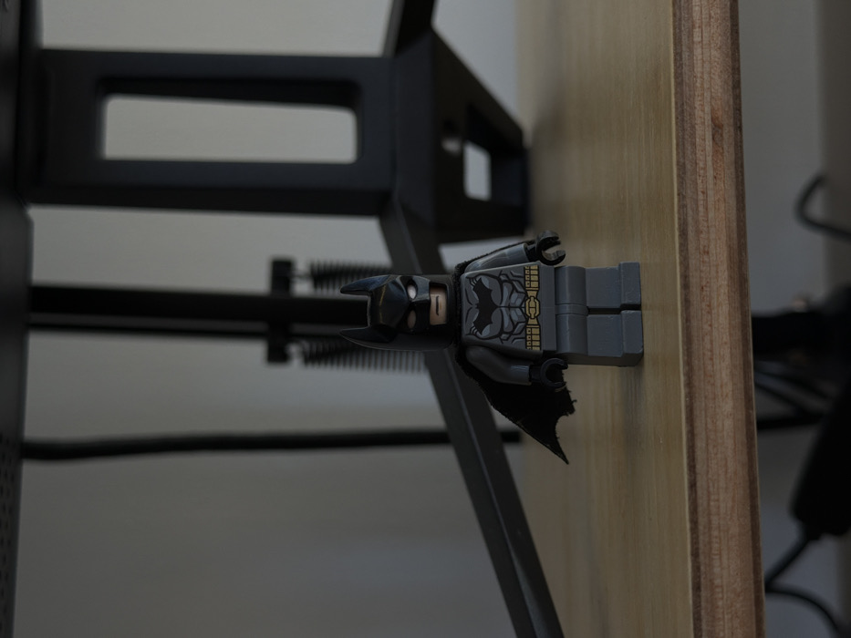 A Lego Batman figurine rests on a light wood surface near a dark gray monitor stand