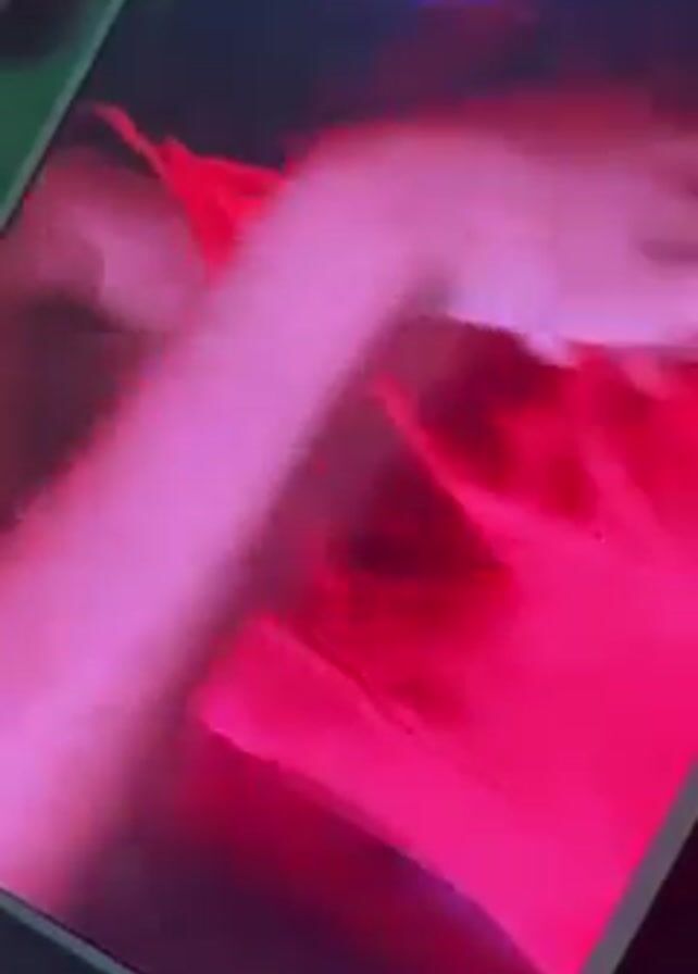 A person wearing a black skirt and a red top is lying on red stairs. The person is wearing a black bra underneath. Another person wearing a black outfit is standing above the person on the stairs. The lighting is red.