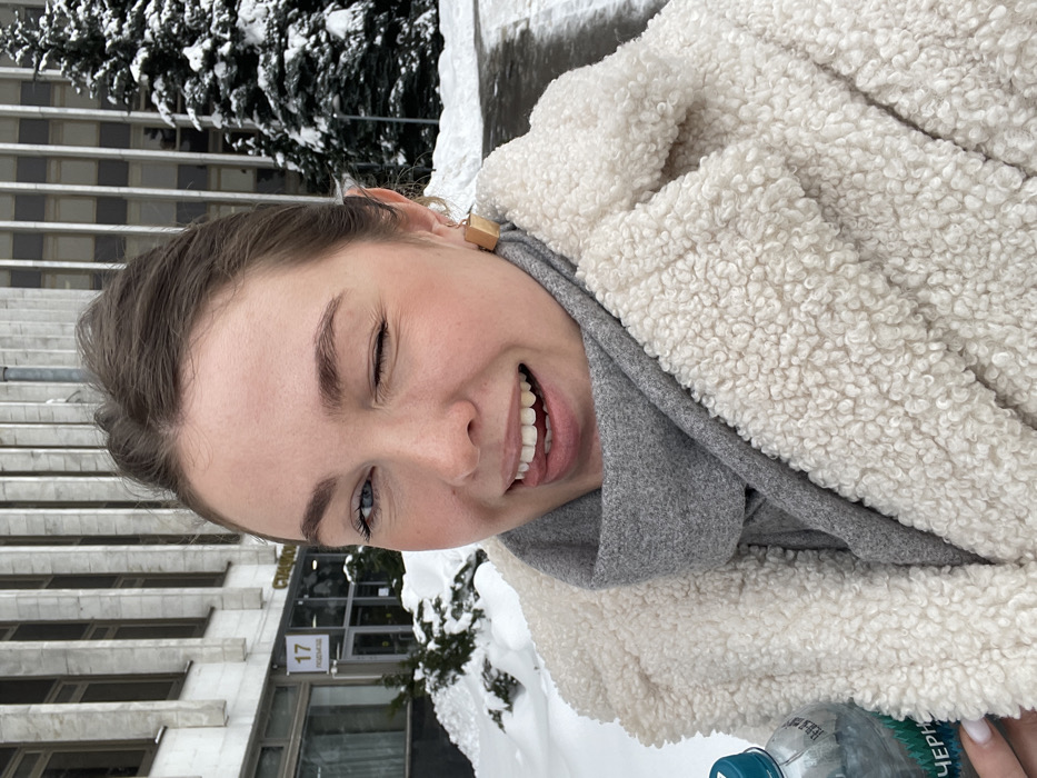 An outdoor, eye-level selfie captures a female subject in a snow-covered urban environment