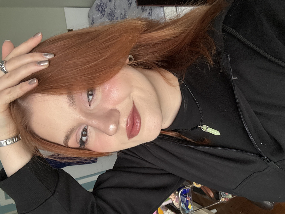 A close-up, chest-up portrait depicts a young adult female in an indoor setting in Varna, Bulgaria. She presents with fair skin, long reddish-brown hair parted to her left, with a section sweeping across her forehead. Her face exhibits applied makeup, including winged eyeliner, light pink eyeshadow, cheek blush, and glossy medium-brown lipstick, accompanied by a slight smile. She is dressed in a black hooded sweatshirt with a partially open front zipper, worn over a black high-neck garment. Her left hand, adorned with a silver-toned patterned bracelet and a silver-toned ring on the middle finger, rests on the crown of her head. A silver-toned ornate ring is present on her right ring finger. Fingernails on both visible hands are painted with a metallic taupe polish. Small silver-toned hoop earrings are worn. Around her neck, a black braided cord necklace displays a light green, pointed crystal pendant in a silver-toned setting. The background to her left features a wall with vertical blue and white stripes. To her right, a segment of a bed with a white sheet bearing a blue floral pattern is visible, alongside a dark headboard. A multi-tiered cart containing various indistinct objects is partially visible in the lower left background.