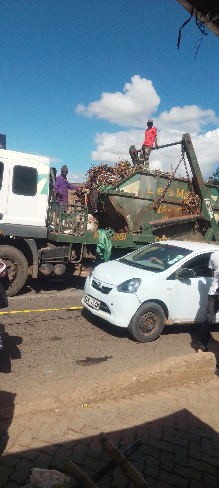 The image depicts a daytime street scene in Nairobi, Kenya, under a clear blue sky with scattered white clouds