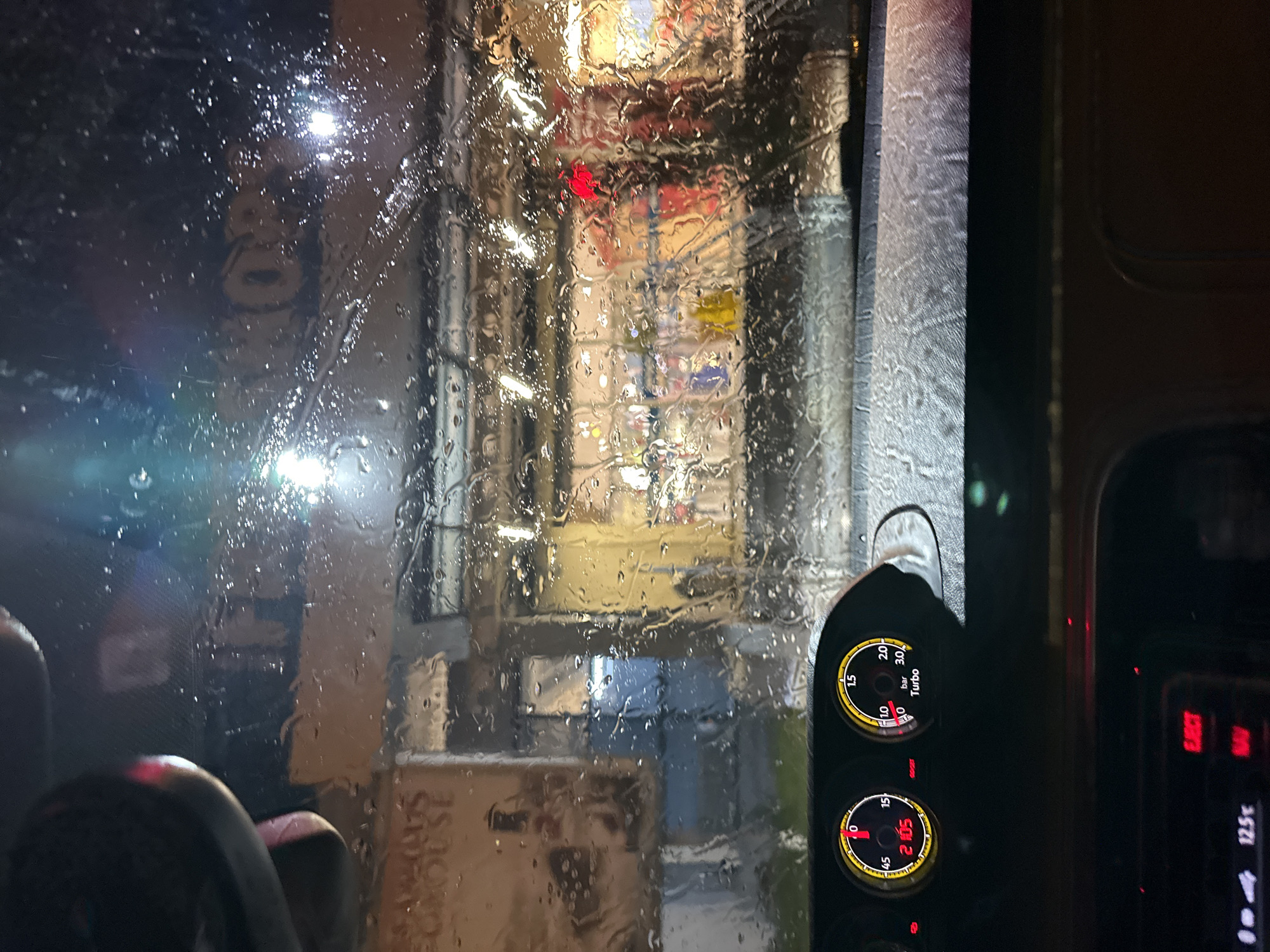 view from inside a vehicle, likely a tractor, looking out through a rain-streaked windshield. The outside scene is blurry and obscured by the rain, but appears to be a building or structure, possibly an industrial area, with various lights and signage visible. A gauge cluster inside the vehicle is visible, showing the turbo pressure and another reading, along with a digital display showing "12.5℃". The location is inferred from the text "SHOUSE" possibly a brand name. There is nothing else to confirm that this image is from Δημοτική Ενότητα Προμαχώνος, Greece. The rain is a prominent feature, distorting the external view and creating a sense of enclosure.