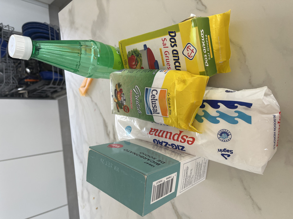 The image displays a collection of household and kitchen items arranged on a white, grey-marbled countertop in a modern kitchen, specifically located in La Barra, Uruguay. In the background, white kitchen cabinetry is visible, along with a stainless steel dishwasher containing blue plates and other dishes. The items on the countertop, from left to right, include: 1. A vertical teal-green cardboard box, labeled "SAFI BICARBONATO DE SODIO" (Sodium Bicarbonate), with a barcode and a partial expiration date reading "VENC. SET 26". 2. A clear plastic bag containing white, fibrous material, identified as "ZIG-ZAG espuma" and "Sagrin ALGODON HIDROFILO" (Absorbent Cotton), prominently displaying "INDUSTRIA URUGUAYA" and "HECHO EN URUGUAY" (Made in Uruguay). 3. A green and yellow flexible pouch of "Celusal SAL GRUESA TODDY YODADA" (Coarse Iodized Salt), with "La Sal de la Vida" tagline. 4. A green and yellow cardboard box, partially inverted, for "DOS ANCLAS SAL GRUESA YODADA FLUORADA" (Coarse Iodized Fluoride Salt), indicating "CONTENIDO NETO 500g". 5. A translucent green plastic bottle with a white screw cap, containing a clear liquid, labeled "VINAGRE DE ALCOHOL" (Alcohol Vinegar) and showing "CONT. NETO 1L". 6. A small, flat orange plastic object is partially visible on the countertop behind the green bottle. No individuals are present, and no specific actions or interactions are occurring beyond the static arrangement of the objects on the countertop.