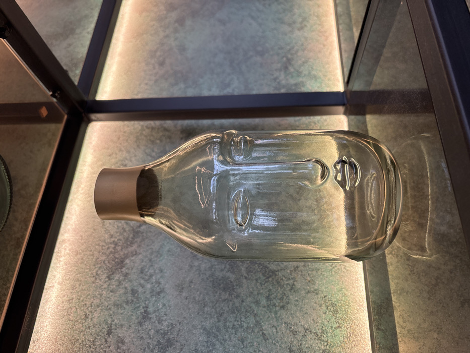 - "An upward-angled view captures a clear glass bottle or vase, designed with a stylized human face in relief, standing upright on a dark, reflective shelf" by FM-CAOHw1, licensed under CC BY 4.0
